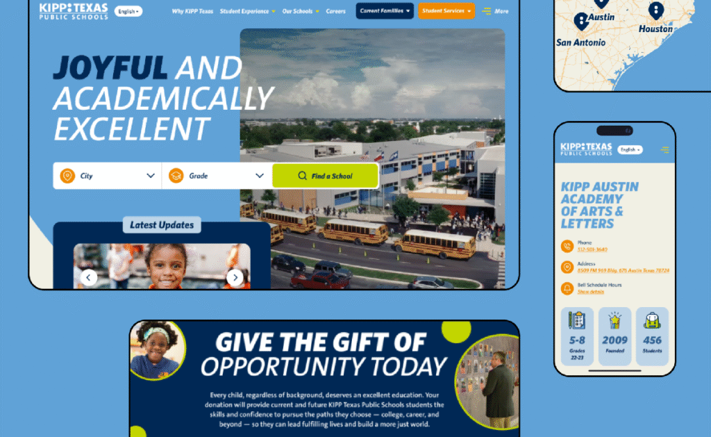 KIPP Texas presented unique challenges. From streamlining navigation to showcasing campaign messages, our task was to transform pain points into portals of growth. In a dance of pixels and code, we revamped the site, providing prospective and existing families with an immersive journey into the world of KIPP Texas.